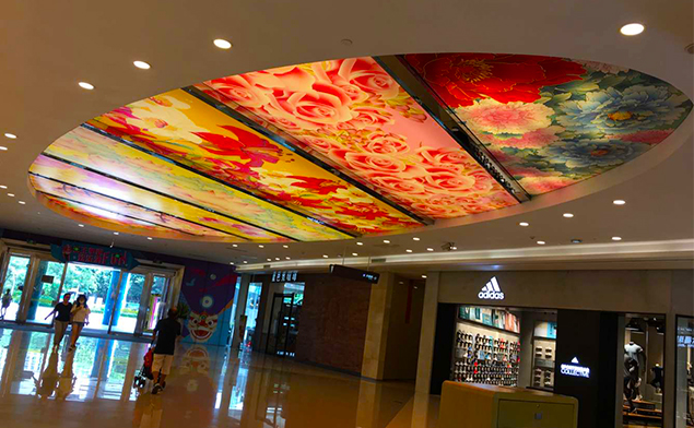卡布軟膜燈箱不僅限于室內壁掛式或是立式的廣告,也不限于正正規規的長方形或正方形,像這種商業類的天花軟膜燈箱現在也是裝飾裝潢的新形勢,特別創意的廣告可以快速吸引消費者眼球.